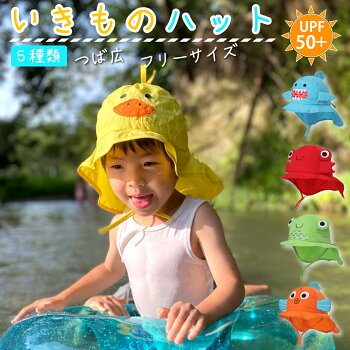 これなら嫌がらない! 【 いきもの ハット 金魚・鮫・あひる・蛙・蟹 】 子ども UPF50+ UVカット かわいい キッズ 帽子 日除け 子供 こども 男の子 女の子 ひもつき ひよけ アウトドア ビーチ 川 つば広 ぼうし 首筋カバー フリーサイズ 46cm 〜 54cm 【送料無料】