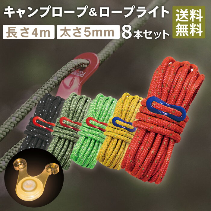 【送料無料!当日発送!】DaLaCa ガイロープ パラコード テントロープ タープロープ キャンプ ロープ 反射 材入り 太さ 5mm 長さ 4m 8本 セット 耐荷重 350kg 自在金具 収納袋 ロープライト 付き