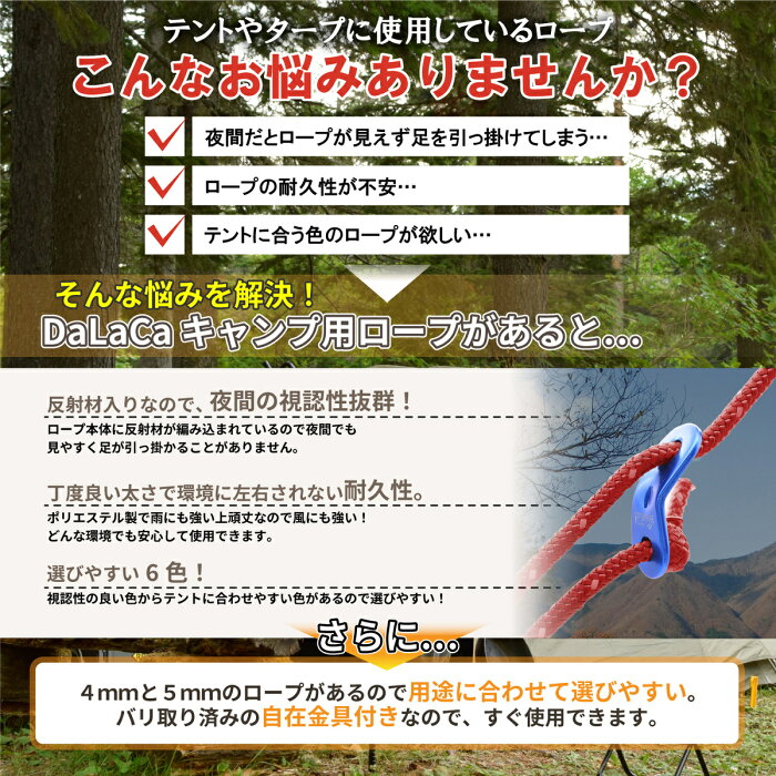 【送料無料!当日発送!】DaLaCa ガイロープ パラコード テントロープ タープロープ キャンプ ロープ 反射 材入り 太さ 5mm 長さ 4m 6本 セット 耐荷重 350kg 自在金具 収納袋 付き