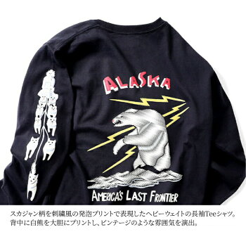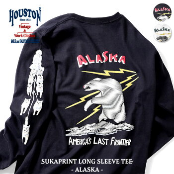 HOUSTON / ヒューストン 22007 SUKAPRINT LONG SLEEVE TEE (ALASKA)/ 刺繍風プリント長袖Tシャツ(アラスカ) 全2色- /ヘビーウェイト/白熊/犬ぞり/ヴィンテージ/スカジャン/リブ/ビンテージ/発泡プリント/ミリタリー/MILITARY/[22007]