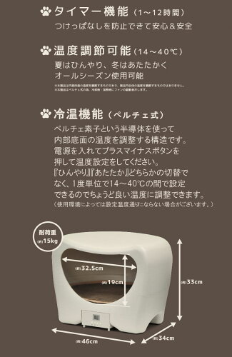 ●サイズ:(約)W460×D340×H330mm ●重量:(約)約2.7kg ●電源:(入力)AC100V 50/60Hz(出力)DC7.5V 3.0A ●定格消費電力:20W ●冷却・加熱方式:ペルチェ式 ●温度設定:(約)14~40℃ ●推奨環境温度:(約)5~35℃ ●安全装置:温度ヒューズ・サーモスタット ●温度ヒューズ:75℃以上でヒューズが切れて電源が切れる ●耐荷重:(約)15kg ●対応ペット:生後3か月以上の犬猫(犬は小型犬) ●入口サイズ:(約)W325×H190mm(最大値) ●運転音:40~46dB ●コード長さ:(約)120cm ●素材:ABS/PE/アルミニウム ●付属品:本体、ACアダプター、敷きパッド、ベアマット、取扱説明書(保証書) ※電源コードは噛みつき防止素材にはなっていますがペットが電源コードをかまないようご注意ください。