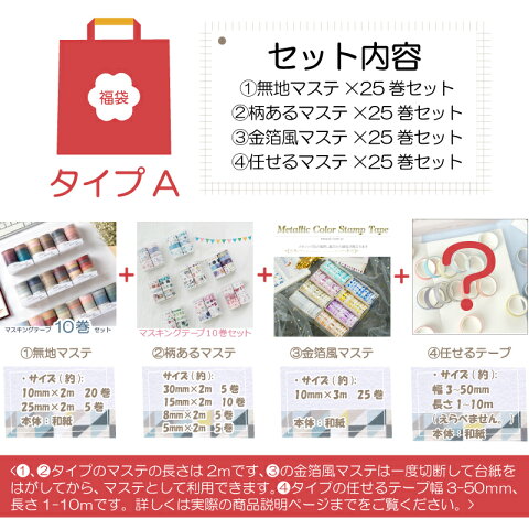■製品のご案内 【cyberplugs お任せるテープ100巻セット】 Aセット サイズ 1、無地マステ:10mm×2m(20巻) 25mm×2m(5巻) 2、柄あるマステ:30mm×2m (5巻) 15mm×2m(10巻) 8mm×2m(5巻) 5mm×2m(5巻) 3、金箔風マステ:10mm×3m(25巻) 4、任せるテープ:幅3~50mm、長さ1~10m(えらべません。