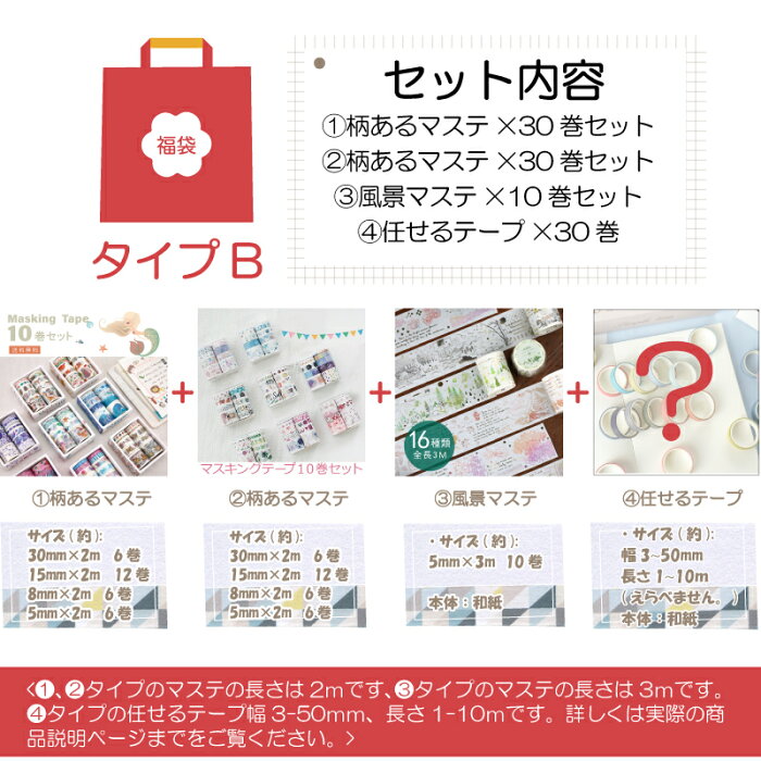 ) (25巻) Bセット サイズ 1、柄あるマステ:30mm×2m (6巻) 15mm×2m(12巻) 8mm×2m(6巻) 5mm×2m(6巻) 2、柄あるマステ:30mm×2m (6巻) 15mm×2m(12巻) 8mm×2m(6巻) 5mm×2m(6巻) 3、風景マステ:5mm×3m(10巻) 4、任せるテープ:幅3~50mm、長さ1~10m(えらべません。