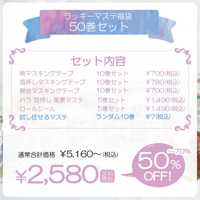 ■製品のご案内 【cyberplugs お任せるテープ50巻セット】 無地マスキングテープ:10mm×2m(8巻) ,25mm×2m(2巻) 箔押しマスキングテープ:10巻セット 柄マスキングテープ:30mm×2m(2巻), 15mm×2m(4巻), 8mm×2m(2巻) ,5mm×2m(2巻) バラ 箔押し 風景マステ: 5cm X 3m(5巻) ロールシール:100枚/巻(5巻) 試し任せるマステ:ランダム10巻 【ご注意ください】 ● 柄は選べていただけませんので、ご了承ください。