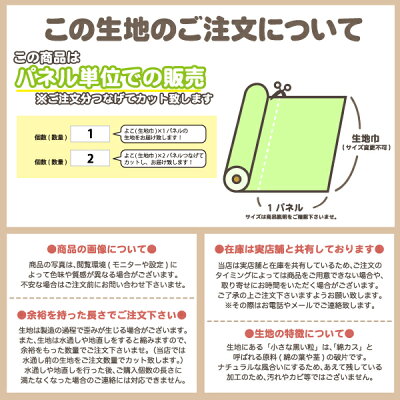 1パネルのサイズ 約108cm×約90cm 素材 綿100% 生地の厚さ 普通 生地の種類 シーチング 商用販売 ○ 再入荷 × パネルカットについて 2パネル以上ご注文の場合、繋げた状態でご用意致します。